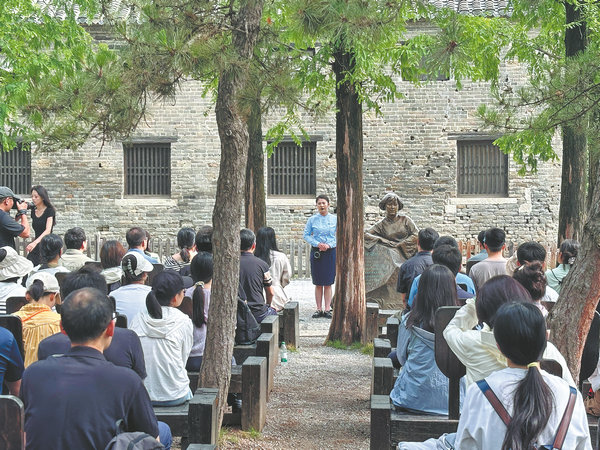 Visitors listen to wartime stories from a guide at the Taierzhuang War Ruins Park. [Photo by Zhao Ruixue/China Daily]